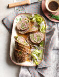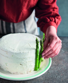 Farcite 2 coppie con la farcia al tonno e 2 coppie con la farcia alle uova. Ricomponete il cilindro. Mescolate il formaggio cremoso con il mascarpone, conditelo con il succo di limone, sale e pepe e spalmatelo su tutto il cilindro. Accorciate gli asparagi di modo che l'altezza sia di poco superiore a quella del cilindro, affettateli per il lungo a fettine sottili e fateli aderire ai bordi con i fili di erba cipollina. Decorate con gli ortaggi e, se vi piace, germogli. Servite la torta fresca.