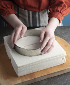 Formate due pile ciascuna con 8 fette di pancarré e accostatele dal lato lungo. Con l'aiuto di un coppapasta posizionato a cavallo delle due pile ritagliate nel parallellepipedo di pane un cilindro di 18 cm di diametro.