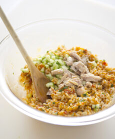 Lessate il riso in abbondante acqua salata in ebollizione. Scolatelo bene, poi lasciatelo asciugare su un canovaccio pulito. Quando sarà freddo trasferitelo in una ciotola.