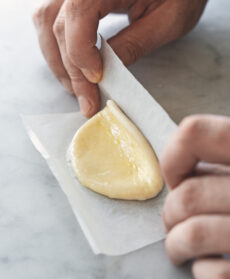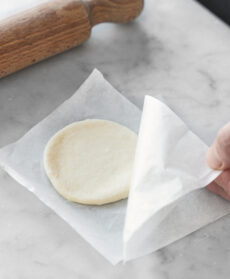 Con il matterello stendete ciascuna in un disco di circa 8 cm di diametro, su un quadrato di carta forno.