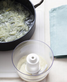 Sgocciolate 1/3 delle cipolle, frullatele e unitele a quelle rimaste nella casseruola. Amalgamatevi il burro morbido, spegnete e tenete da parte. Preparate la pasta: setacciate la farina sul piano di lavoro, disponendola a fontana. Sgusciatevi al centro le uova, unite un pizzico di sale e lavorate l'impasto finché sarà liscio e omogeneo. Formate una palla, avvolgetela in pellicola e fatela riposare per almeno 30 minuti.