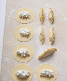 Distribuite il composto a mucchietti, al centro dei dischetti di pasta; piegateli a metà e chiudeteli, sigillando i bordi. Nel frattempo, portate a ebollizione abbondante acqua salata; lessatevi i ravioli e scolateli dopo circa 2 minuti.