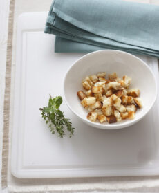 Sciogliete una noce di burro in una padella e fatevi dorare i cubetti di pane. Cospargeteli con il timo e la maggiorana. Distribuite il fondo di cipolle sui piatti singoli e adagiatevi i ravioli. Completate con i cubetti di pane croccante, poche gocce di aceto balsamico e guarnite con germogli di bietola.