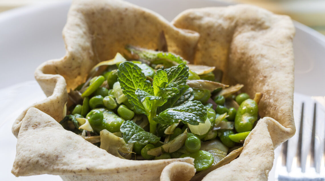 L'impasto dei cestini è preparato con farina integrale, croccante al punto giusto per accogliere le verdure primaverili ed esaltarne il sapore fresco