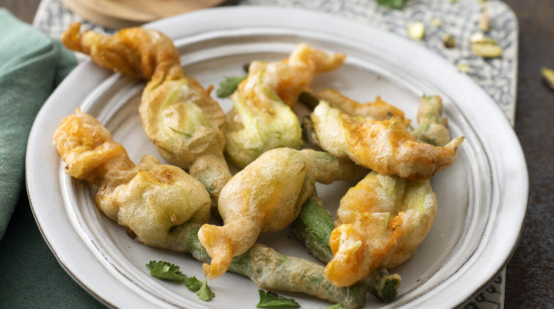 La farcitura di gorgonzola e stracchino gonfia i fiori prima di passarli nella pastella. Un tuffo veloce nell'olio ben caldo e il fritto è croccante