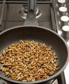 Tostate i pinoli in un padellino antiaderente con un cucchiaino di olio, trasferiteli su carta assorbente e tamponateli. Fateli raffreddare, poi tritateli grossolanamente.