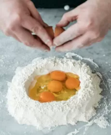 Sul piano di lavoro formate una fontana con la farina e sgusciate al centro le uova; impastate con le mani e proseguite fino a ottenere un composto liscio ed elastico.