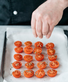 Nel frattempo preparate i pomodorini confit. Lavate i pomodorini, affettateli e disponeteli su una placca foderata con carta forno con la parte del taglio verso l'alto. Conditeli con le foglioline di un rametto di timo, una spolverizzata di origano, un filo d'olio, lo zucchero e un pizzico di sale e infornateli per circa 30 minuti finché non sono caramellati.