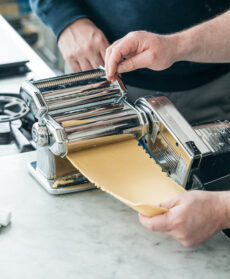 Riprendete l'impasto, suddividetelo in 2 parti e stendetene una passandola più volte nell'apposita macchinetta, fino a ottenere una sfoglia rettangolare di 2-3 mm di spessore. Ripetete l'operazione con la pasta rimasta, formate una seconda sfoglia e appoggiatela su uno stampo per ravioli.