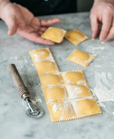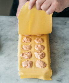 Con un cucchiaino, disponete tanti mucchietti uguali di ripieno ai pomodorini sulla sfoglia, distanziati circa 3 cm. Spennellate i bordi con poca acqua, coprite con la seconda sfoglia, premete con il matterello e staccate i ravioli.