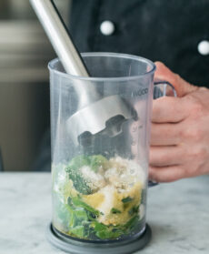 Intanto preparate il pesto. Lavate e asciugate il basilico, trasferitelo nel mixer, aggiungete 1/2 dl di olio, 2 cucchiai di parmigiano, il pecorino e i pinoli e frullate fino a ottenere una salsa cremosa.