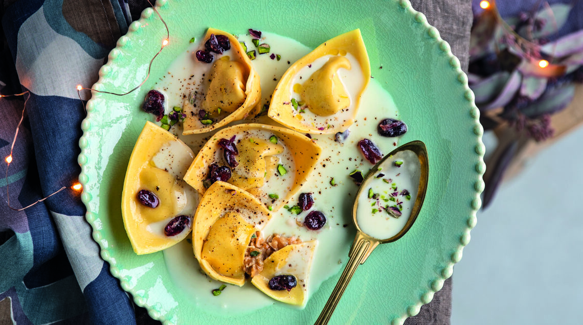 Ravioli fatti in casa come vuole la tradizione, ma con un ripieno all'avanguardia, fatto di cipolle caramellate con zucchero di canna, sfumate con l'aceto e mescolate alla ricotta. Inaspettata la decorazione con pistacchi e cranberry