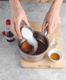 Mescolate in una casseruolina 2 dl di acqua, la salsa di soia, la salsa di pesce (o brodo di pesce ristretto), la vodka e lo zucchero.