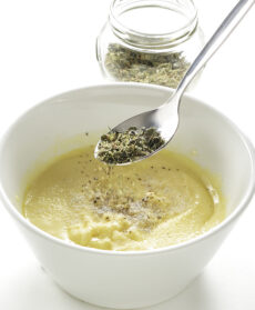 Spellate gli scalogni, lavateli, affettateli sottili e rosolateli in una padella con un filo d'olio, sale e una noce di burro. Frullate la panna con le uova, lo squacquerone, gli scalogni, sale e pepe. Profumate con un pizzico di origano e mescolate.