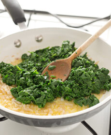 Spellate lo scalogno, tritatelo finemente e fatelo appassire nel tegame con 2 cucchiai di olio, unite gli spinaci e le bietole, le foglioline di maggiorana e rosolate tutto a fuoco vivace, sempre mescolando, finché avranno perso l'acqua di vegetazione.