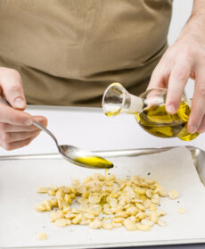 Mettete a bagno le fave in acqua tiepida per 20 minuti. Scolatele, sciacquatele e cuocetele in un pentolino coperte d'acqua fredda per 30 minuti. Prendetene 2 cucchiai, distribuitele su una placchetta foderata con carta da forno, conditele con un filo d'olio, sale e pepe e fatele asciugare in forno a 140° per 5-6 min.