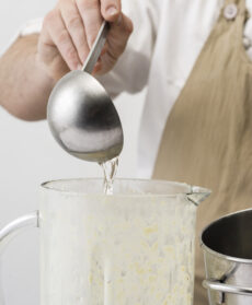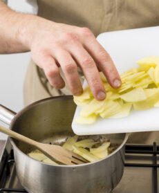 Soffriggete gli scalogni tritati in una casseruola con un filo d'olio e sfumatelo con il vino; aggiungete la patata sbucciata tagliata fine, 2 dl d'acqua calda e cuocete finché sarà ben cotta. Lasciate intiepidire, scolate la patata e frullatela a velocità moderata aggiungendo man mano un mestolo del fondo di cottura fino a ottenere una salsa cremosa; aumentate la velocità, unite il burro restante a tocchetti e 200 g di pecorino, poco alla volta alternandolo con un goccio del fondo di cottura, per mantenere la giusta cremosità. Infine aggiungete metà del pepe pestato.