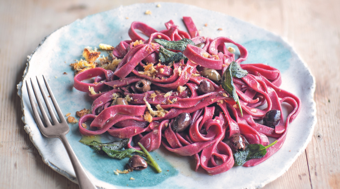 Un primo di pasta fresca che mette allegria. Le tagliatelle rosa fatte in casa sono condite con pochi e semplici ingredienti, burro, pane e olive e rese croccanti dalla salvia fritta. Un piatto vegetariano che stupisce