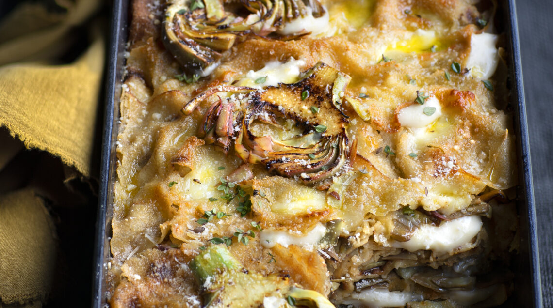 3 Formate altri 2 strati nello stesso modo; al termine, coprite con il pane carasau rimasto ammollato nel brodo, stracchino, emmentaler, Parmigiano Reggiano, il burro a fiocchetti e le fettine di carciofo tenute da parte. Cuocete nel forno a 200° per circa 20 minuti. Sfornate, poi lasciate leggermente intiepidire, profumate con qualche fogliolina di timo e servite.