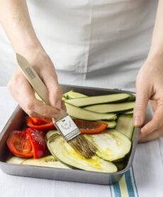 Sciacquate le verdure e asciugatele. Spuntate le zucchine e la melanzana e riducetele a fettine di 3-4 mm di spessore. Eliminate il picciolo dei peperoni, tagliateli a falde e privateli delle nervature e dei semi interni. Spennellate tutte le verdure con poco olio.