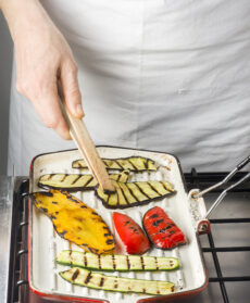 Cuocetele su una piastra ben calda: 2 minuti per lato le zucchine e le melanzane, 4-5 minuti per lato i peperoni.