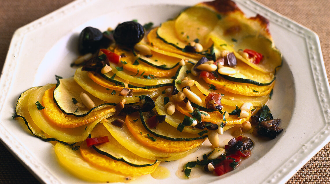 1 Sbucciate le patate. Affettatele fini, tagliate dello stesso spessore anche zucca e zucchine e salate. Ungete d'olio il fondo di una teglia e distribuitevi le verdure in file regolari alternando i tre tipi.