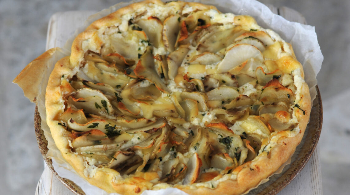 Il ripieno si gioca sul sapore indeciso dei topinambur, tra patate e carciofi, che si tuffa nella besciamella e si mescola alla scamorza. Ci pensa il guscio di sfoglia e mettere ognuno al suo posto. Una passata in forno e il capolavoro vegetariano è pronto da servire a fette, calde o tiepide