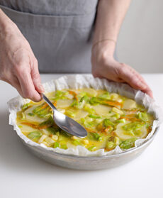 Versate il composto nella tortiera foderata con carta da forno bagnata e strizzata. Livellate bene il composto e cuocete in forno caldo a 180° per 25-30 minuti, finché sarà ben rassodato. Sfornate la tortilla, tagliatela a fette o a quadrotti e servitela con qualche goccia di riduzione di aceto balsamico.
