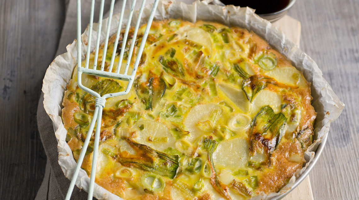 Golosa torta salata di ispirazione spagnola a base di patate e fiori primaverili. Con il gusto dolce acidulo dell'aceto balsamico
