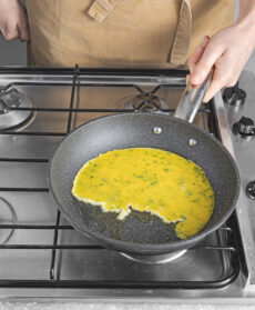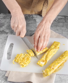 Arrotolate le frittatine preparate e tagliatele a listarelle di 0,5 cm. Distribuitele a strati in 4 pirofile condendo ogni strato con salsa di pomodoro, un mix di pecorino e parmigiano reggiano Dop grattugiati e completate con qualche foglia di menta tagliuzzata. Infornate a 180° per 15 minuti e servite.